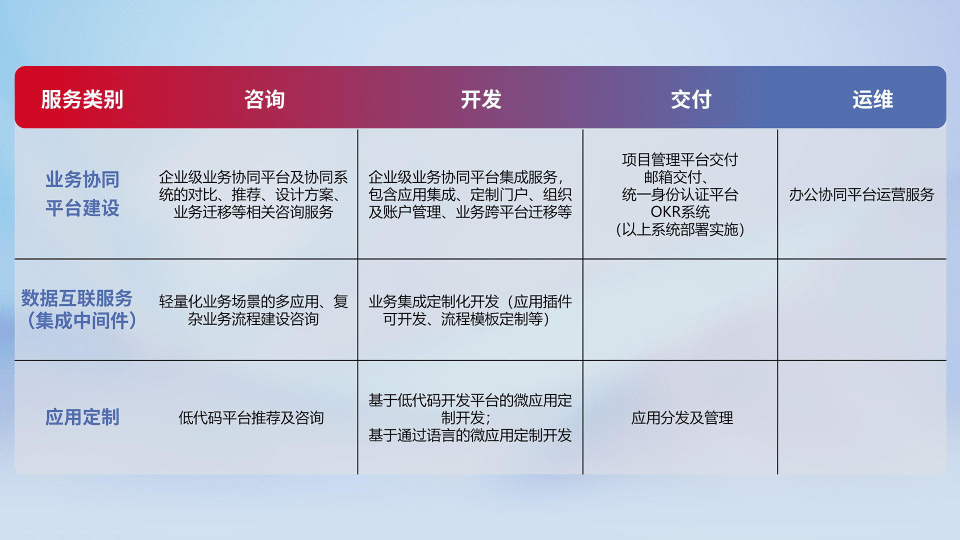 针对钉钉、、、、企微、、、IDaas等平台级产品提供产品的规划、、、方案、、交付、、、、定制化开发等服务,,,实现如统一协同办公、、、、智能客户服务、、混合会议管理、、智能数据查询、、、、等业务场景,,,实现数字化转型。。