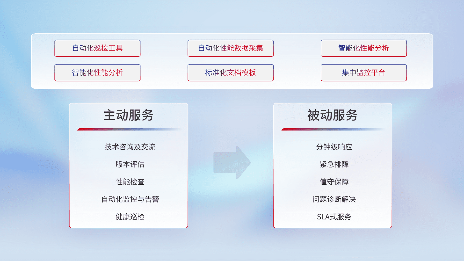 智能化工具和标准化文档,,保障服务质量,,,提供主动服务(包含技术咨询、、、、版本评估、、、性能检查、、、、自动化监控与告警、、、、健康巡检)和被动服务包含(分钟级响应、、、紧急排障、、值守保障、、、、问题诊断解决、、、SLA服务)。。。